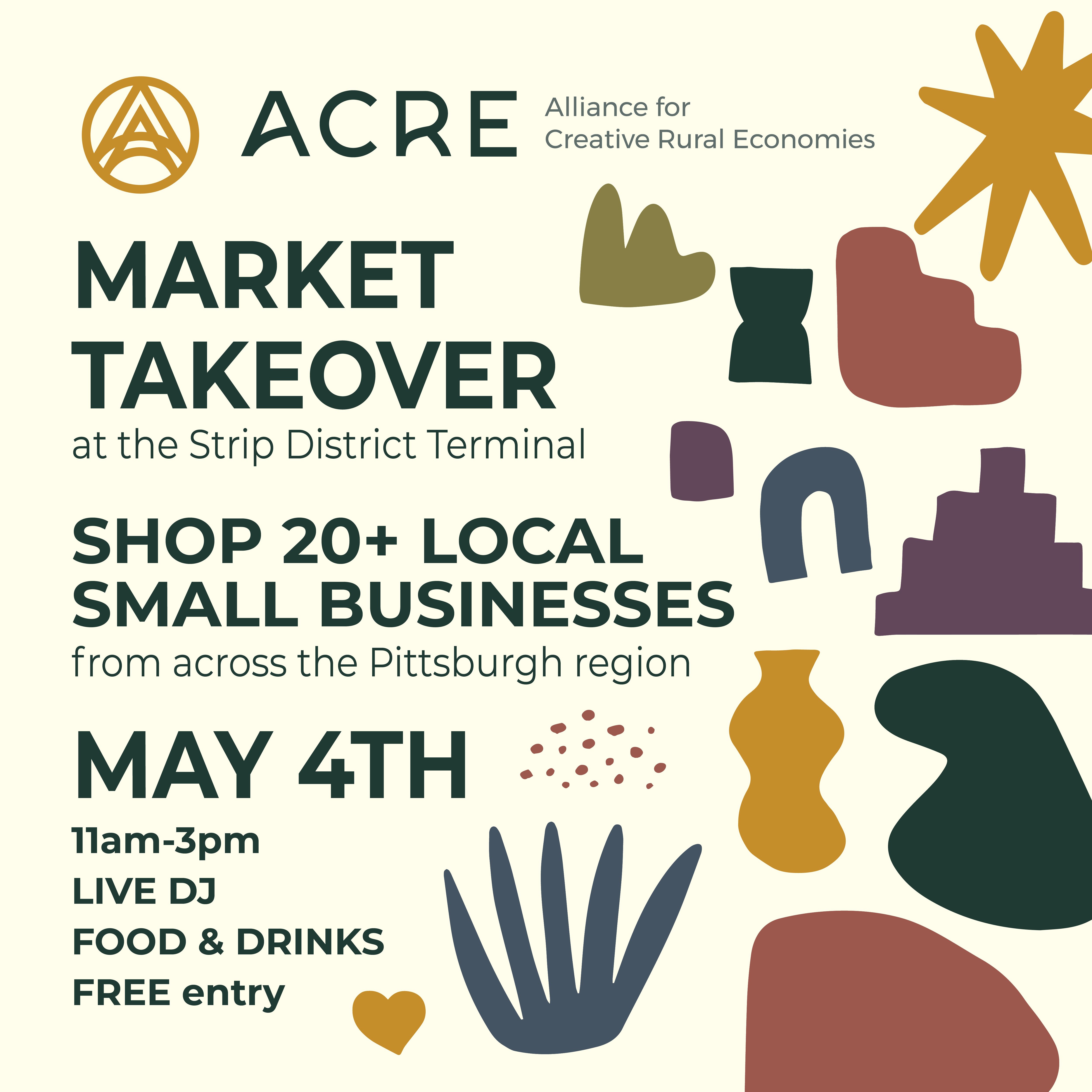 Join us for an ACRE Market Takeover on Saturday, May 4 from 11 AM - 3 PM. Shop from 20+ small vendors from across the Pittsburgh region while enjoying music by DJ Breis Gordan and refreshing beverages from City Winery and Aslin Beer Co.