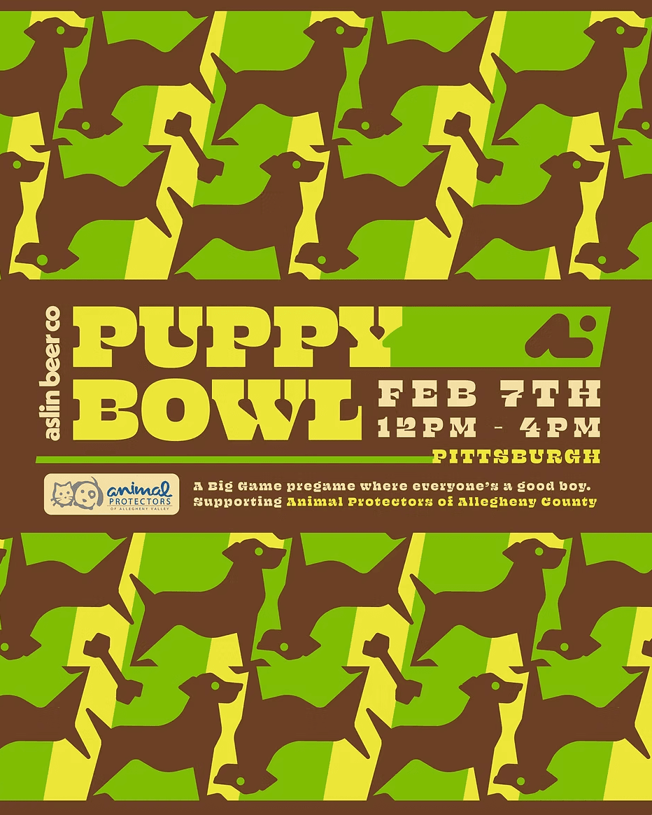 Join Aslin Beer Co. for Puppy Bowl on Friday, February 7 from 12-4PM. This dog-friendly big game pregame supports Animal Protectors of Allegheny County and features good pups, great beer, and pregame fun ahead of the Super Bowl.